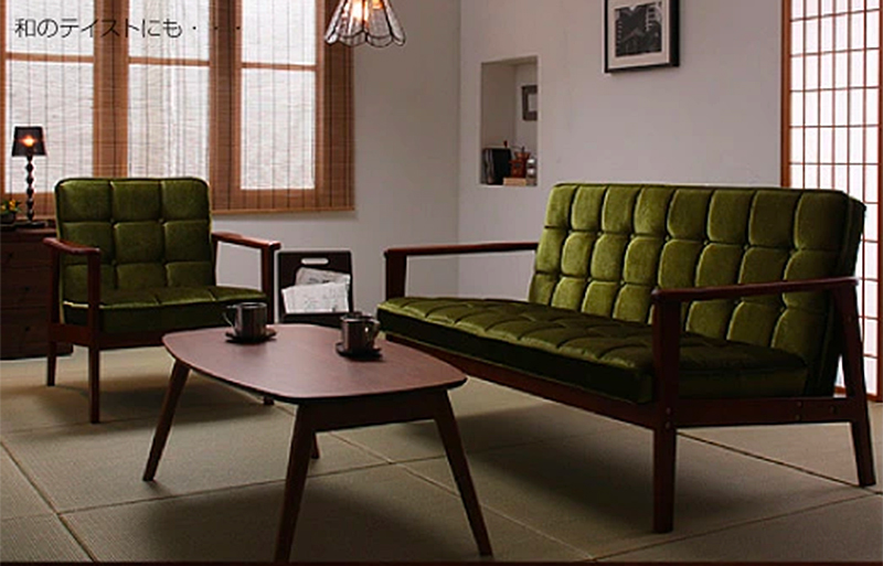 居心地のいいカフェのような、木製フレームの3人掛けレトロデザインソファ