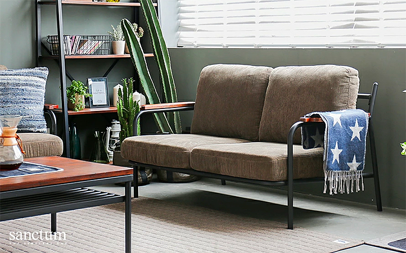 コーディロイとアイアンを組み合わせた、おしゃれなヴィンテージ風ソファ