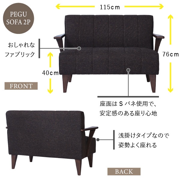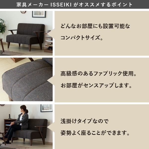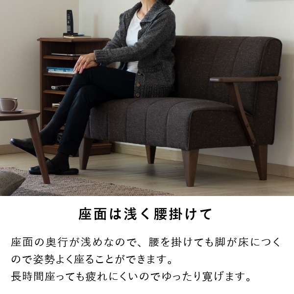落ち着きのあるミディアムブラウン色のコンパクトな2人掛けソファです。脚部と肘掛けはアッシュ無垢材、座面と背もたれはファブリックとなっておりますので、温かみのある異素材の組み合わせをお楽しみいただけます。ワンルームや子供部屋にも置きやすい、小さめサイズのソファです。また、座面の奥行が浅めに作られていますので、女性やお子様にお勧めのソファとなっております。