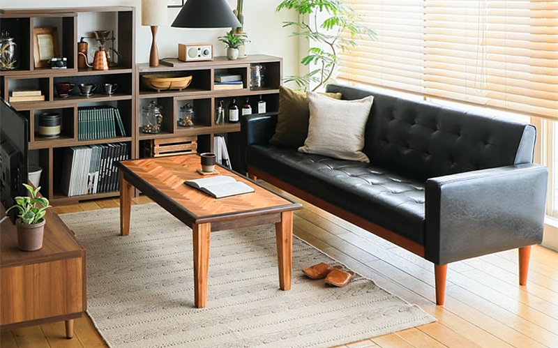 お部屋の中で存在感を放つソファ。レザーアームで重厚感あり、高級感のある雰囲気を醸し出します。大人の男性が、ベッド代わりに横たわって仮眠もできるくらいの大きさです。脚を取り外せばローソファーとしても使えるので、圧迫感を抑えられます。暑い季節には、い草のマットや畳の上に置いても涼しげに。
